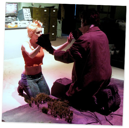 Frankie (Jason Shain) pleads with Prozak (Ali Dineen) for help.